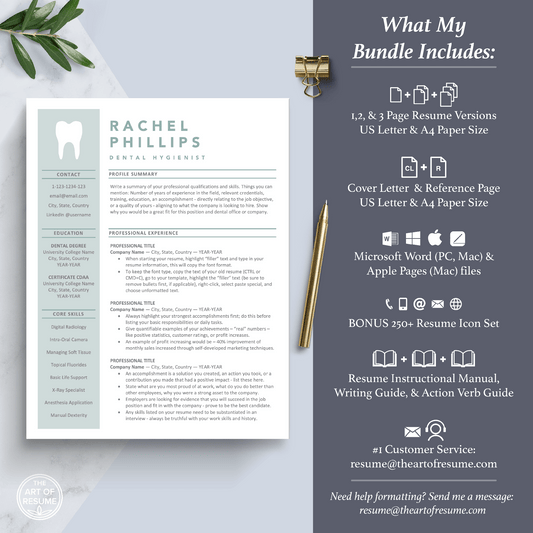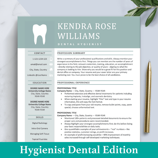Dental Resume Design | Hygienist CV Resume Template | Dental Student